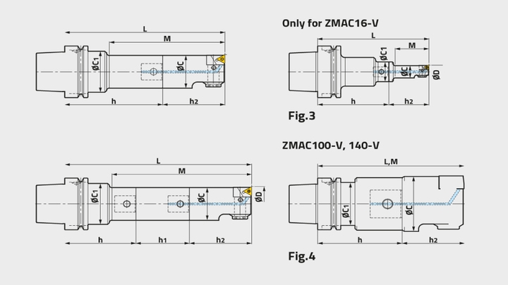 Takım sapına bağlı olarak standart modüler ZMAC ve ZMAC Alpha (ZMAC25’den) delik işleme başlıklarımız 10 boyda mevcuttur: